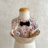 まるで草花が踊るように咲き誇る、英国リバティ社の人気柄「Felda(フェルダ)」のデザインがプリントされた生地を贅沢に使用。 繊細な筆致と色彩の美しさが際立ち、お子さまの可愛らしさを引き立てる華やかでクラシカルな印象です。 裏地には上品な光沢のシャンパンベージュを合わせ、特別な日や記念日のお食事シーンにも映える佇まいに仕上げています。