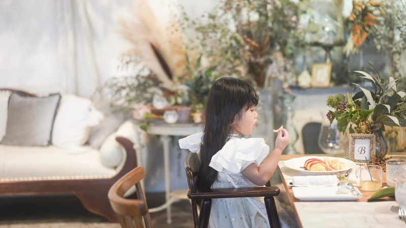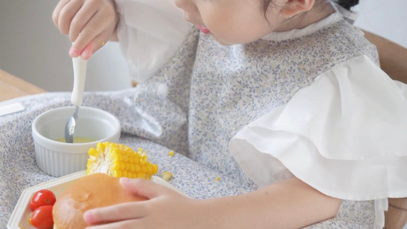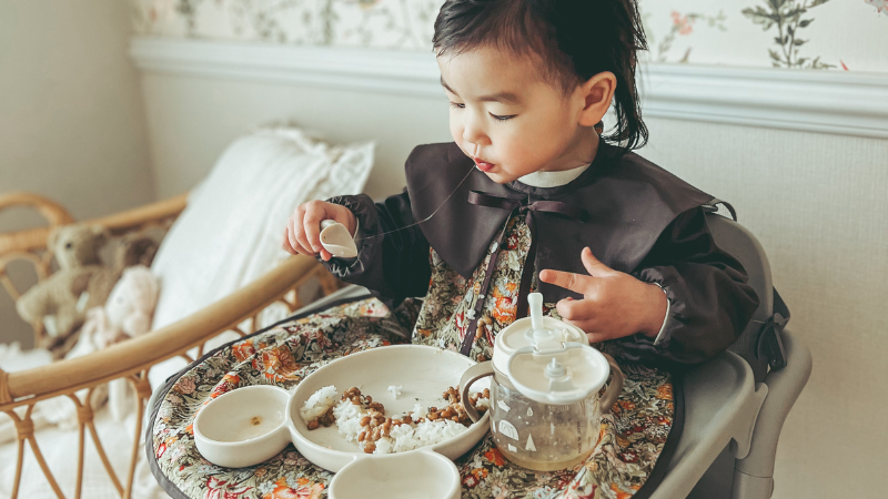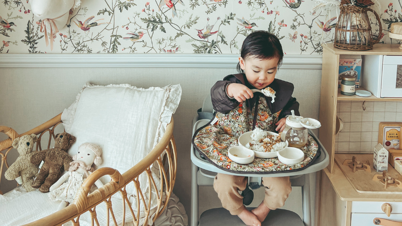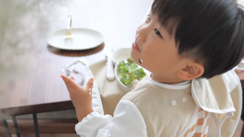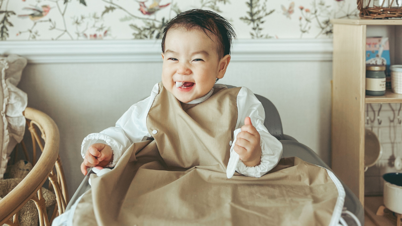 食べこぼし対策まで整えたい方は、ロングタイプで食べこぼしを受けやすいお食事エプロンを取り入れるのもひとつの方法です。