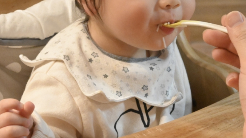 特に離乳食後期〜幼児食期は、スプーンを前に突き出したり、手づかみで食べ物を落としたりすることが増える時期。