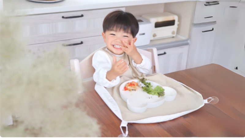 離乳食後期は、手づかみやスプーン練習が始まり、食べこぼしや準備の負担が一気に増える時期ですよね。