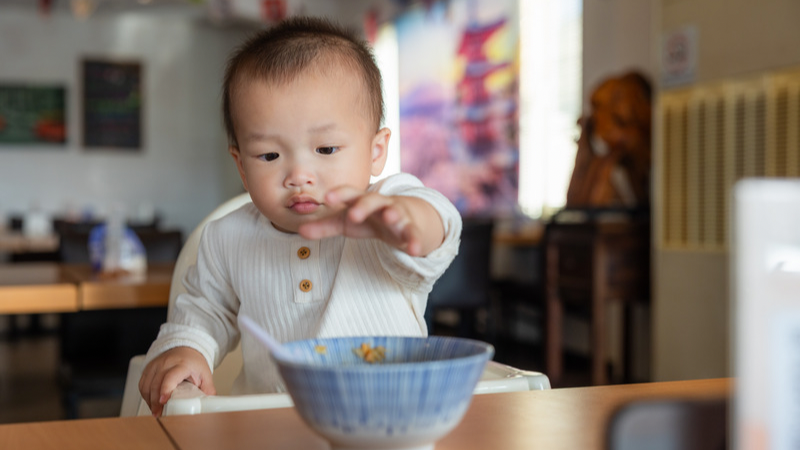 急に立ち上がったり、口いっぱいに入れたりすることもあるので、食事中は必ず大人が近くで見守ることが大切。 特に麺類は、赤ちゃんにとって楽しい食べ物でもあるので、無理に急がせず、ゆっくり食べる時間を作ってあげると安心ですよ。食べこぼし対策におすすめのアイテム