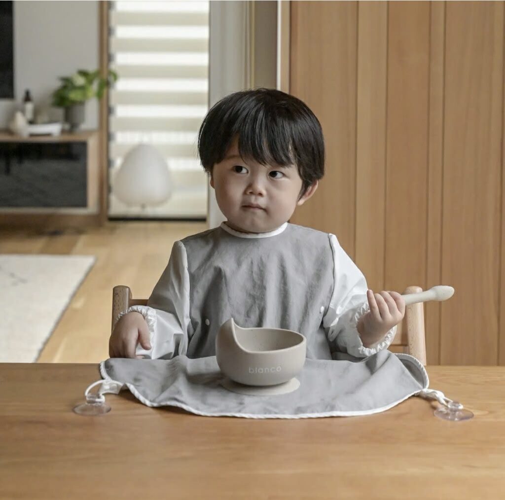 我が家では、最初は少量だけお皿に出して、食べたら追加する方法にしたところ、食べこぼしがかなり減りました。また、そんな時は食べこぼしを防ぐためにSAMOEのロングお食事エプロンを使って、汚れないように工夫したりしていましたよ。