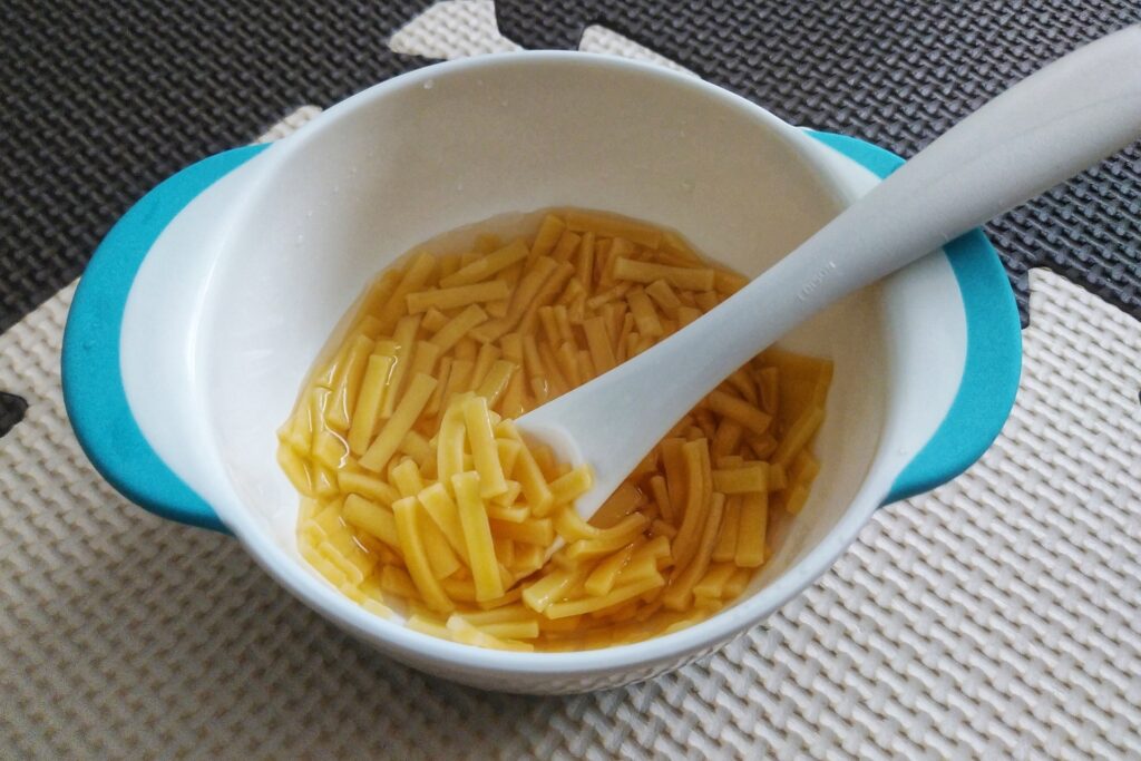 ワンオペで時間がない日でも、ゆでるだけで簡単に主食が準備できるのでとても助かりました。 ただ、ベビー用うどんは少し価格が高めなので、慣れてきたらスーパーの普通のうどんを使う家庭も多いと思います。その場合は、ゆでた後に流水でしっかり洗ってから使うと、麺の表面の塩分を落としやすくなりますよ。